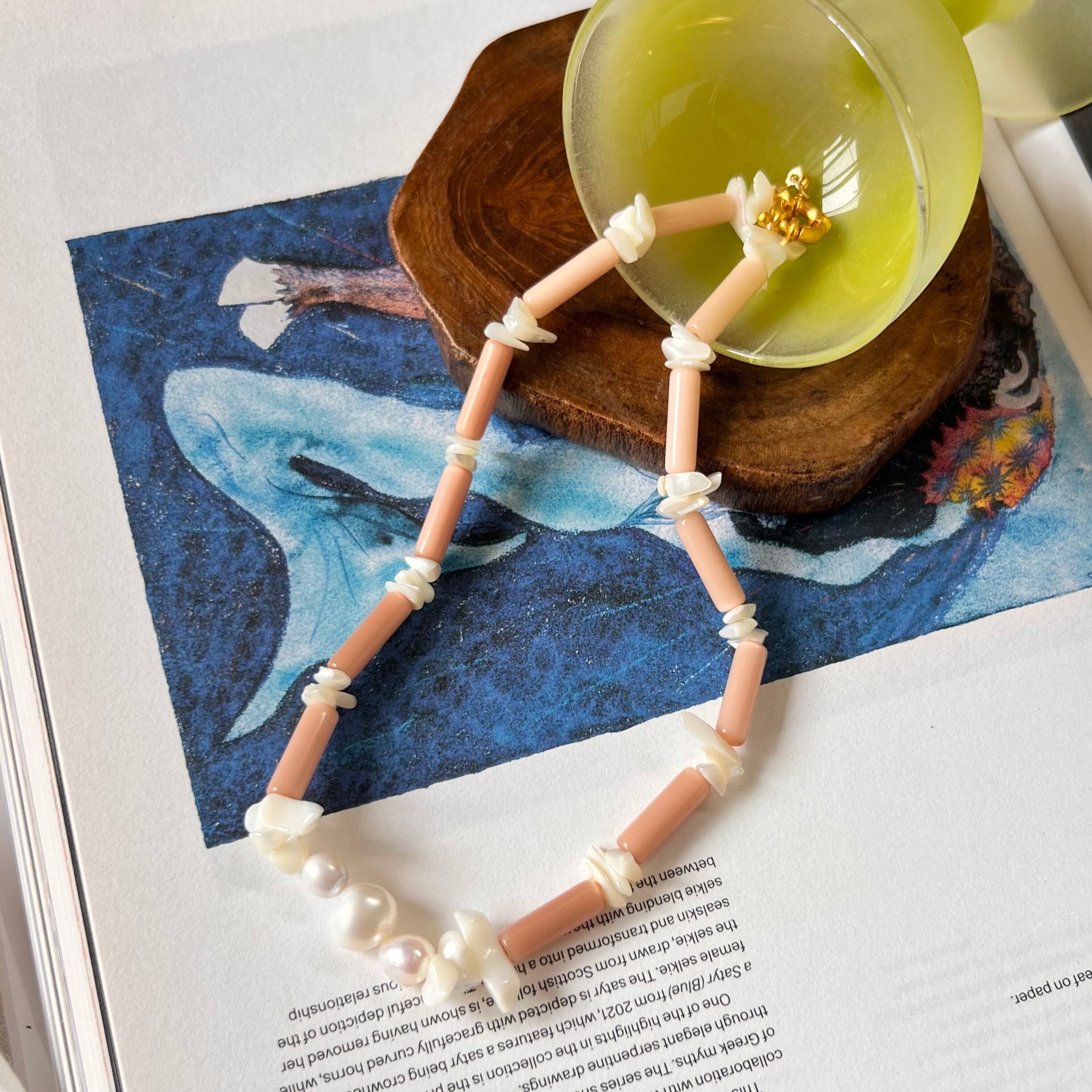 淡いブルー、グリーン、ピンクのインポートのスティックビーズが、春夏のコーディネートにやわらかく彩りをプラスし、マザーオブパールや淡水パールの質感がアクセントになっていて、ナチュラルながらも高級感があるデザインです。
