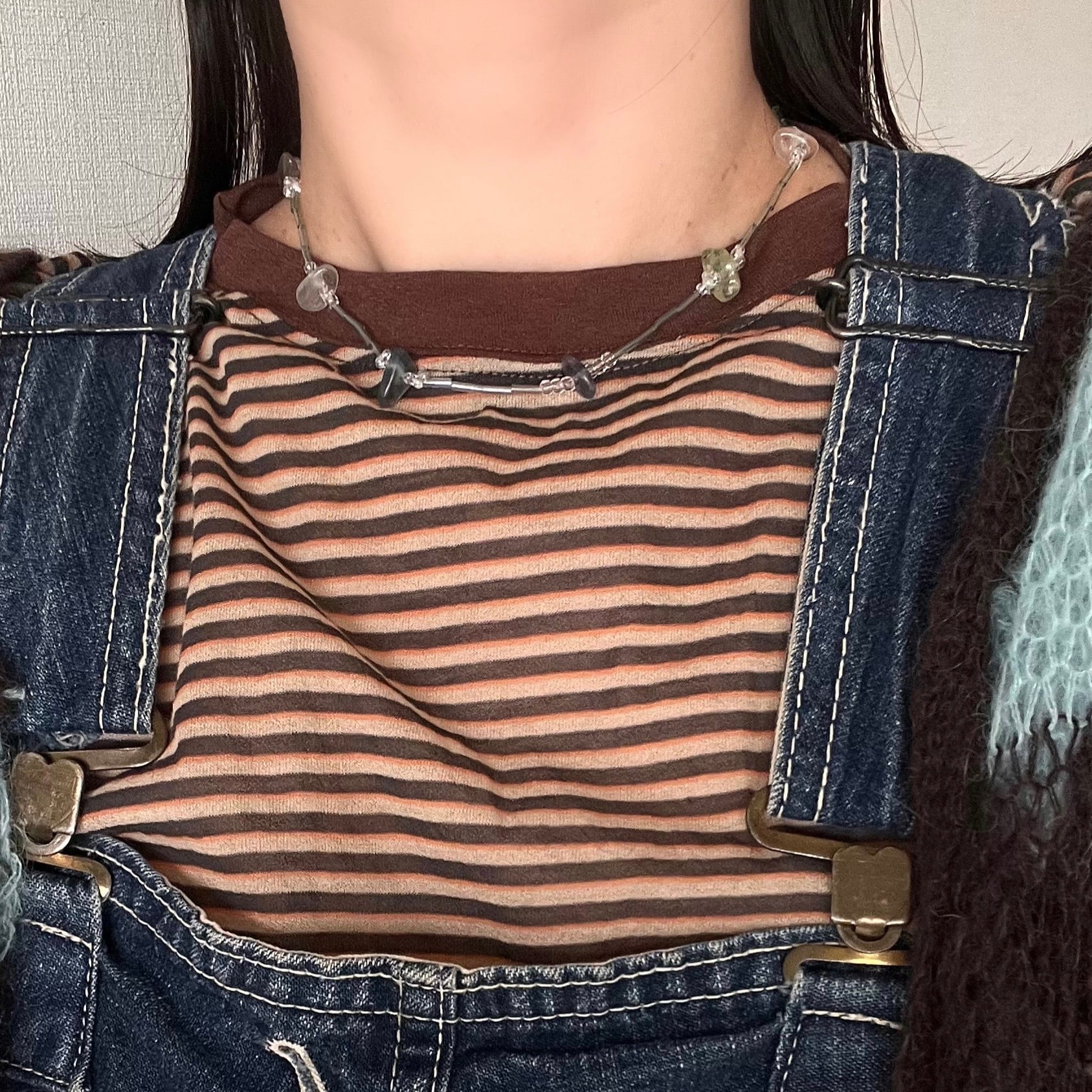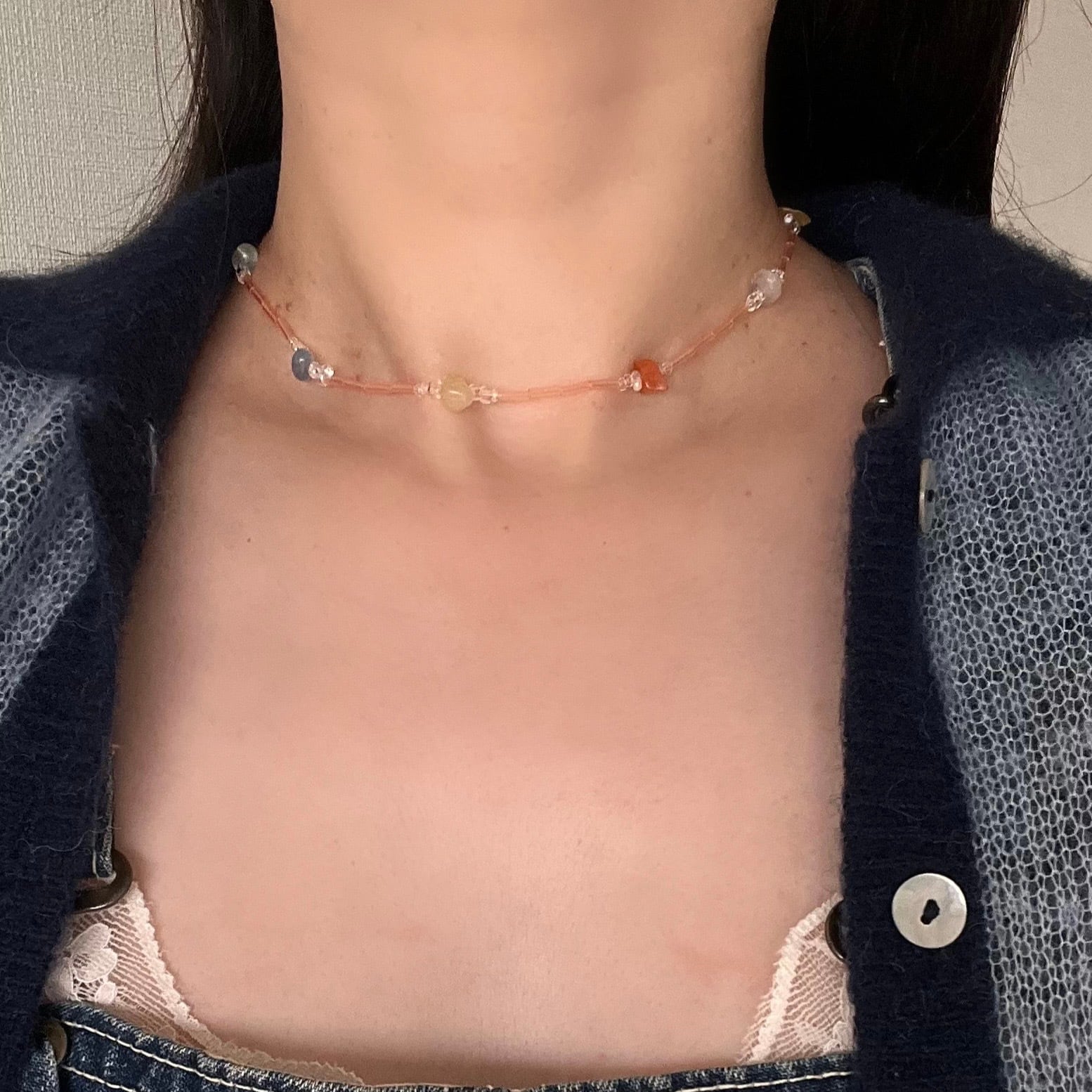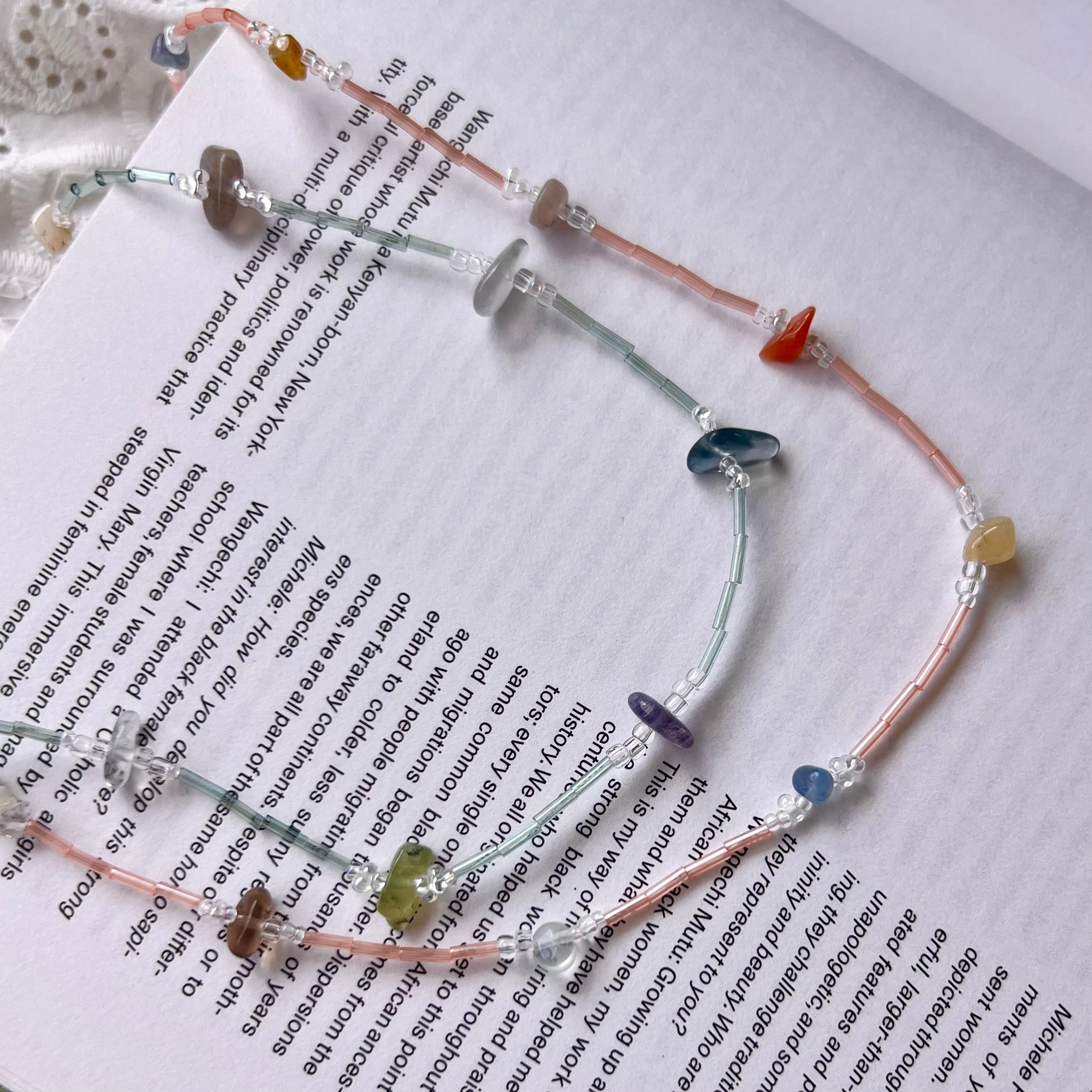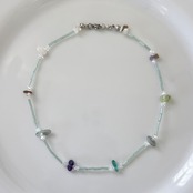 淡くカラフルなスティックビーズが、コーディネートにやわらかく彩りをプラスし、カラフルな天然石が質感がアクセントに◎