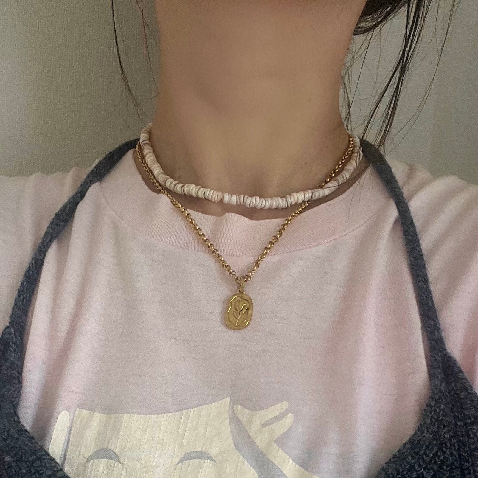 可愛らしいピンクシェルにゴールドのマグネット留め具が上品なアクセントとなり、大人の女性にぴったりなカジュアルネックレスです。