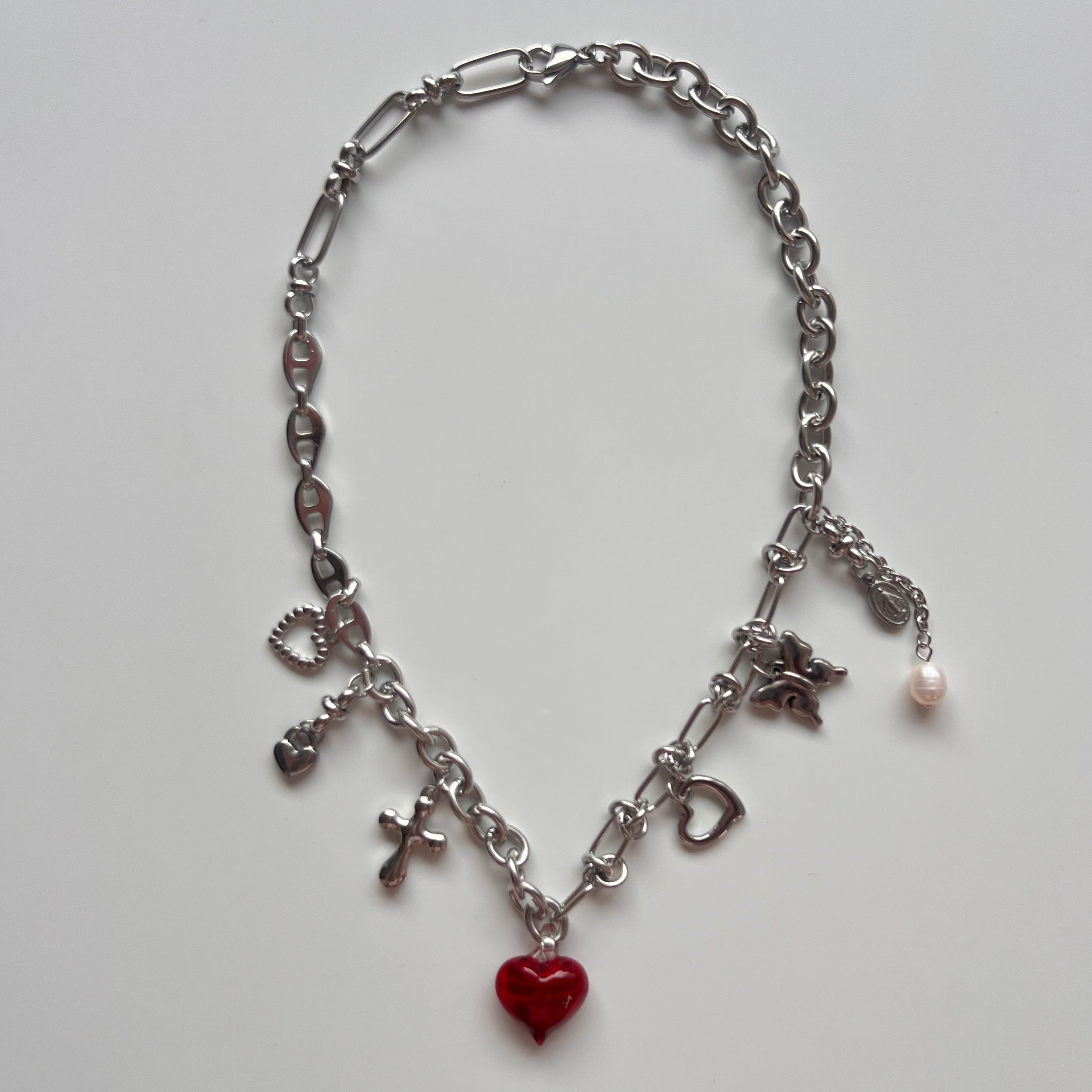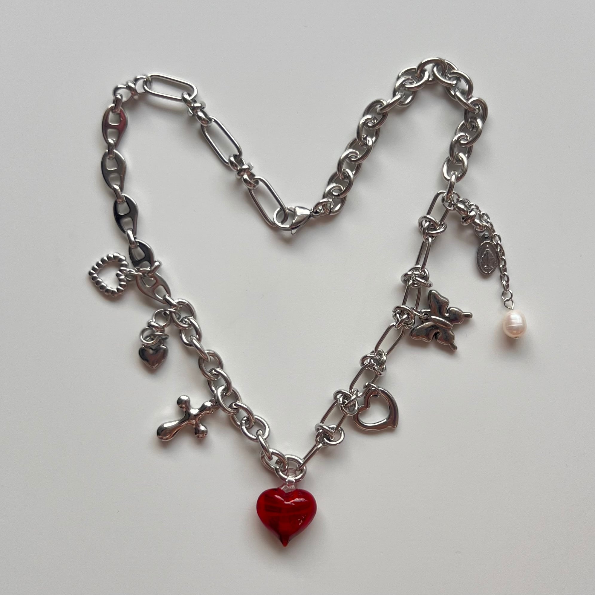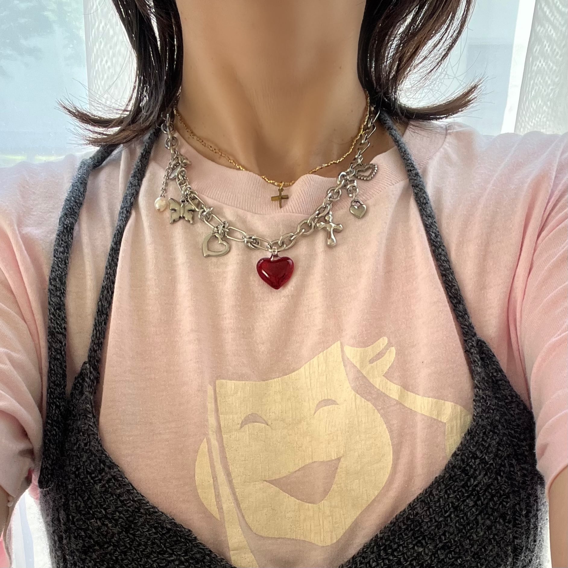 Red glass charm necklaceは深い赤色のガラスハートチャームにパールと様々なチャームを組み合わせたが個性的なデザイン。