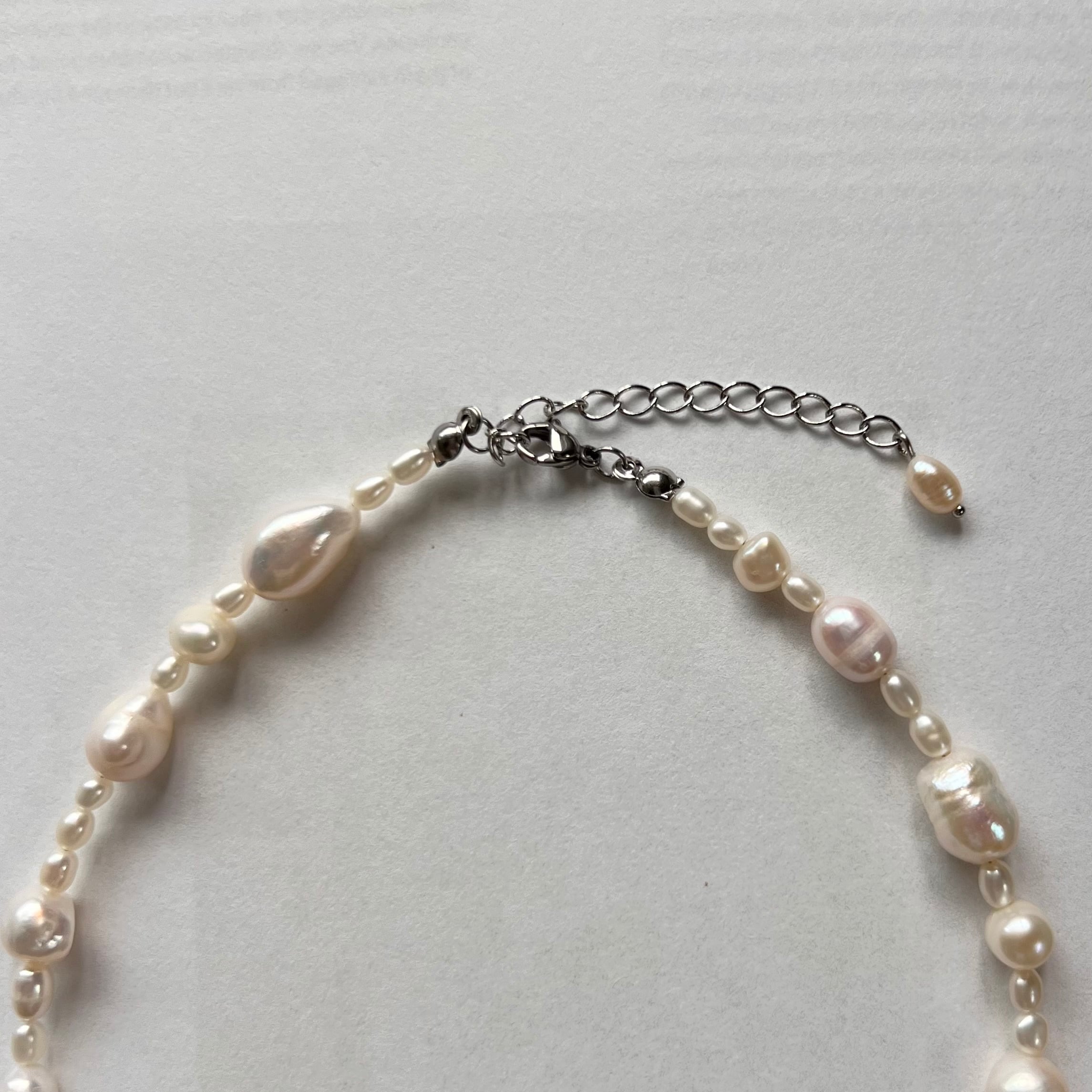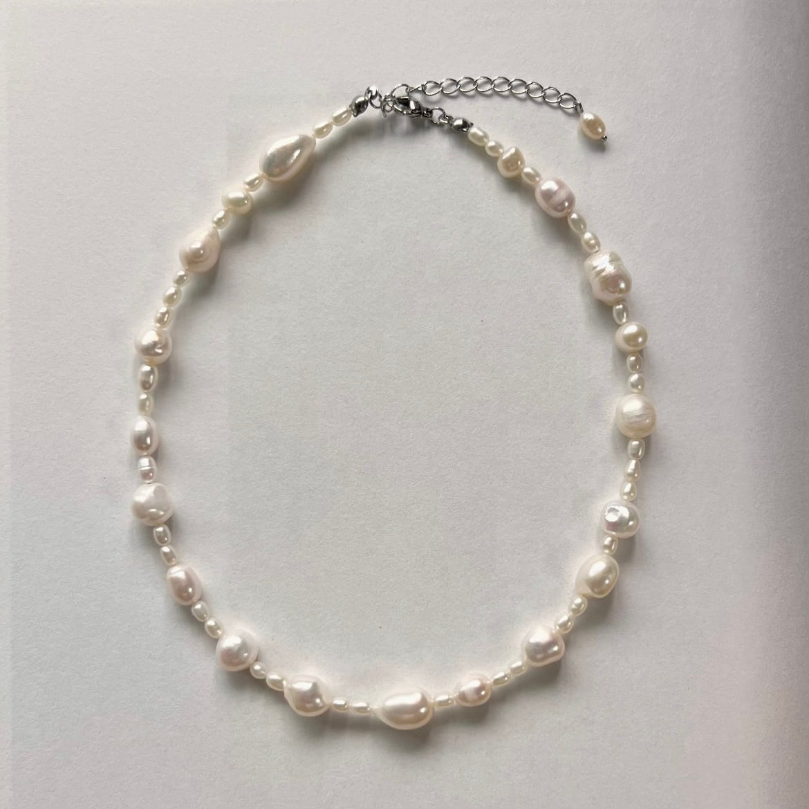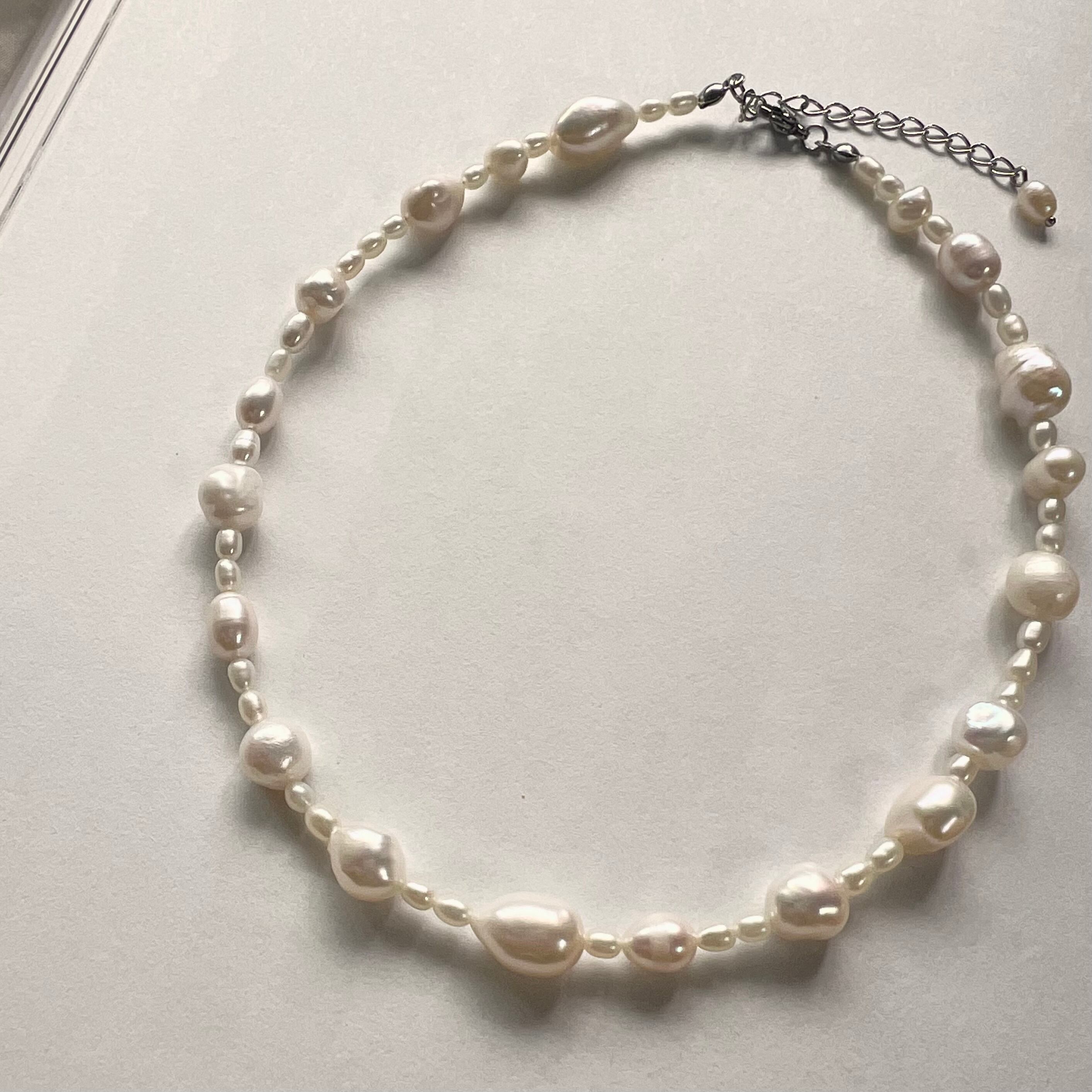 様々な大きさの本真珠と淡水パールを組み合わせたパールネックレス。華やかでありながら繊細な印象のパールネックレスです。どんなお洋服にも合わせやすく、重ね付けにもぴったりなデザイン。